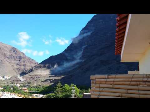 Short video of dust plumes taken at the end of a rockfall in Valle Gran Rey between Lomo del Riego and Borbalan (see images of another nearby: A spectacular landslide and rockfall ). These rockfalls and landslides happen every now and then as a result of loosening material due to temperature changes, erosion and especially after rain. In most cases, as in this one which happened about three weeks ago, no harm is done as houses are usually built well away from areas where rocks may fall, preferably on the top of ridges, called 'lomos'.
